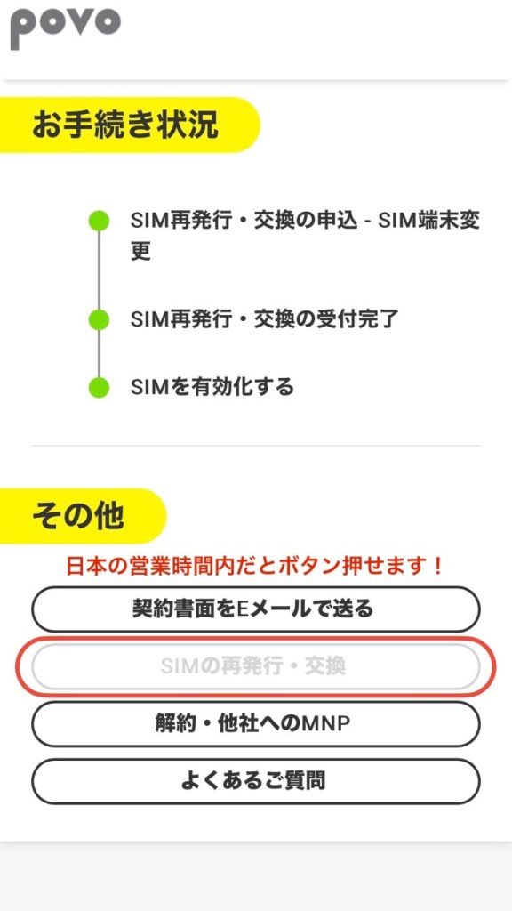 povo2.0は、機種変更した場合のeSIM引継ぎには、eSIMの再発行手続きが必要だそうで。以下がアプリからの再発行手続きの操作方法です。