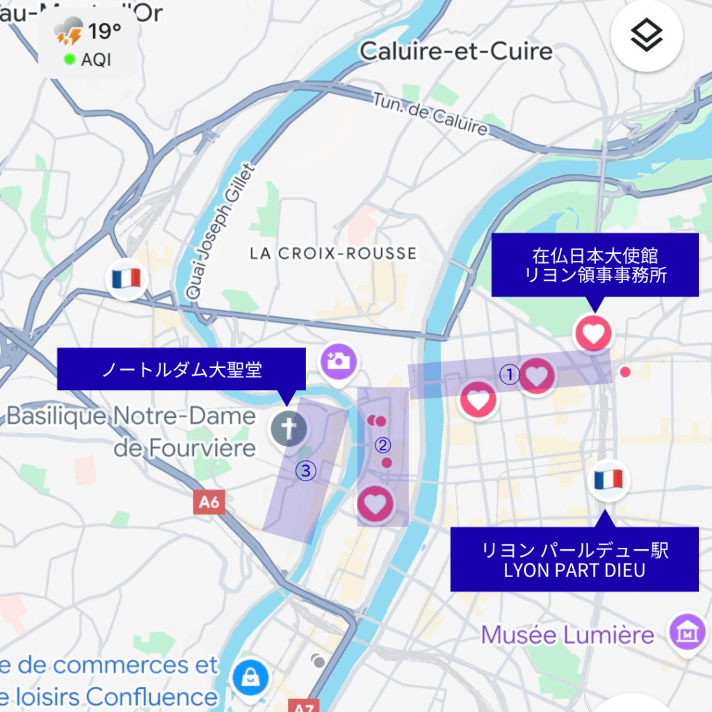 橋を渡ったら、リヨンの中心地である➁のエリアに突入!